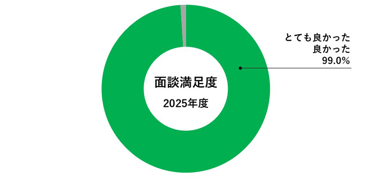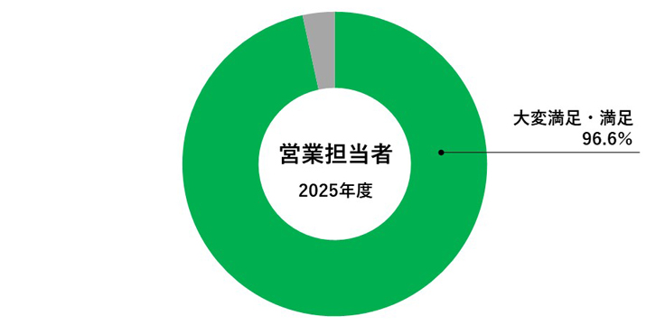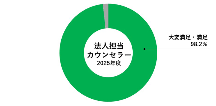 顧客満足度 1. EAPの契約更新率は97.2%(合併等の理由は除く) ほとんどのクライアント企業様には継続的に弊社サービスをご利用頂いております。 2. 面談カウンセリング後の満足度 2025年度は、99%が「とても良かった・良かった」と回答しています。 3. クライアント企業ご担当者様の満足度について 弊社では年1回、クライアント企業の人事担当者様に満足度調査を実施しています。 営業担当者、法人担当カウンセラーともに9割を超える満足度でした。