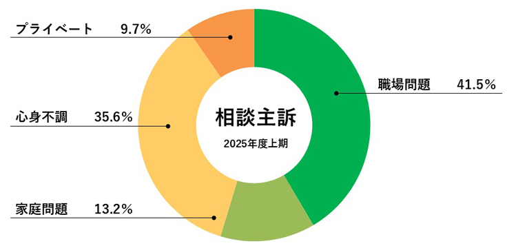 職場問題でのご利用が全体の半数近くありますが、家庭問題や心身の不調、プライベートの問題まで幅広くご相談いただいております。